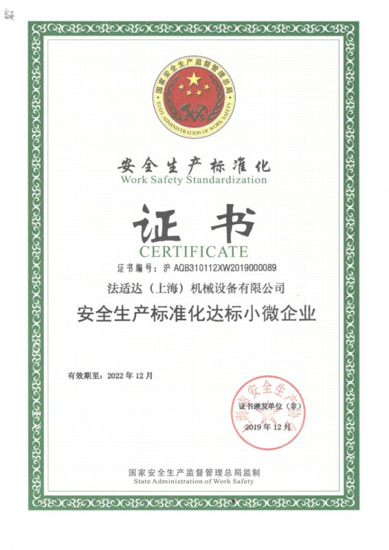 法適達通過安全標準化認定,拿到上海市安全協會頒發的證書。